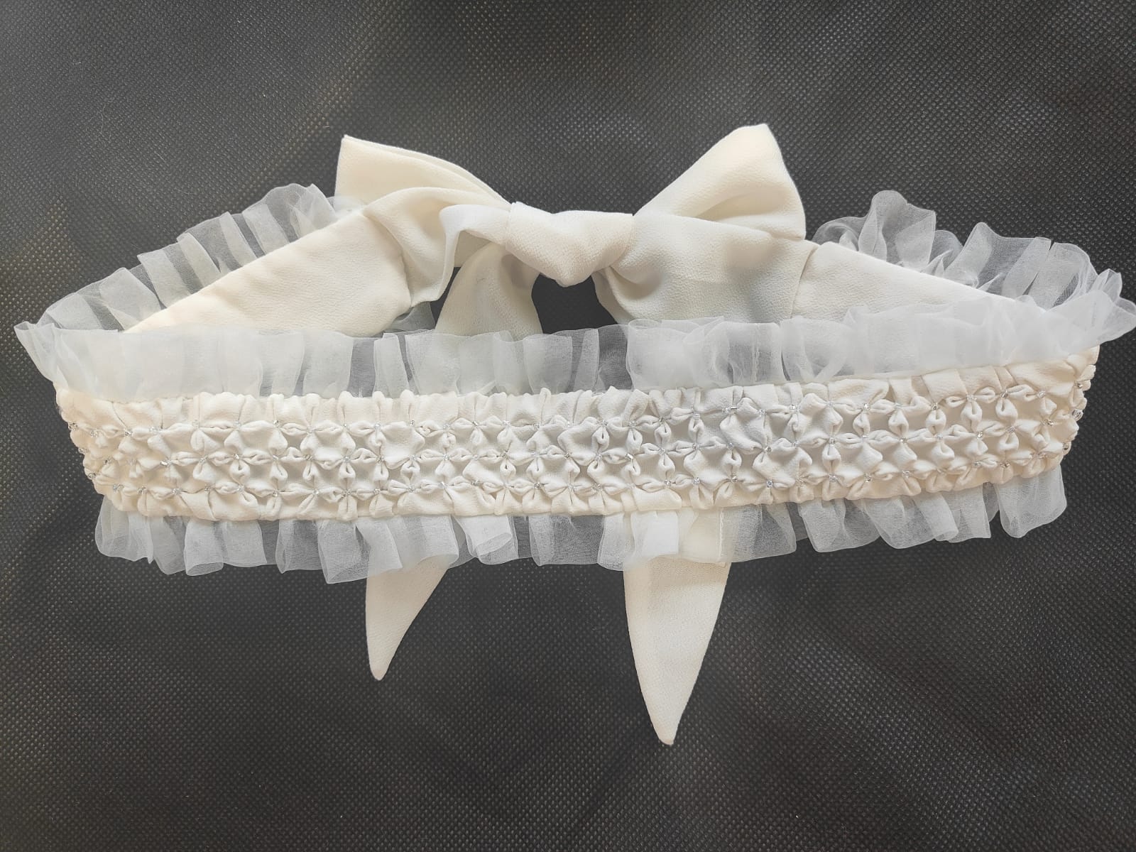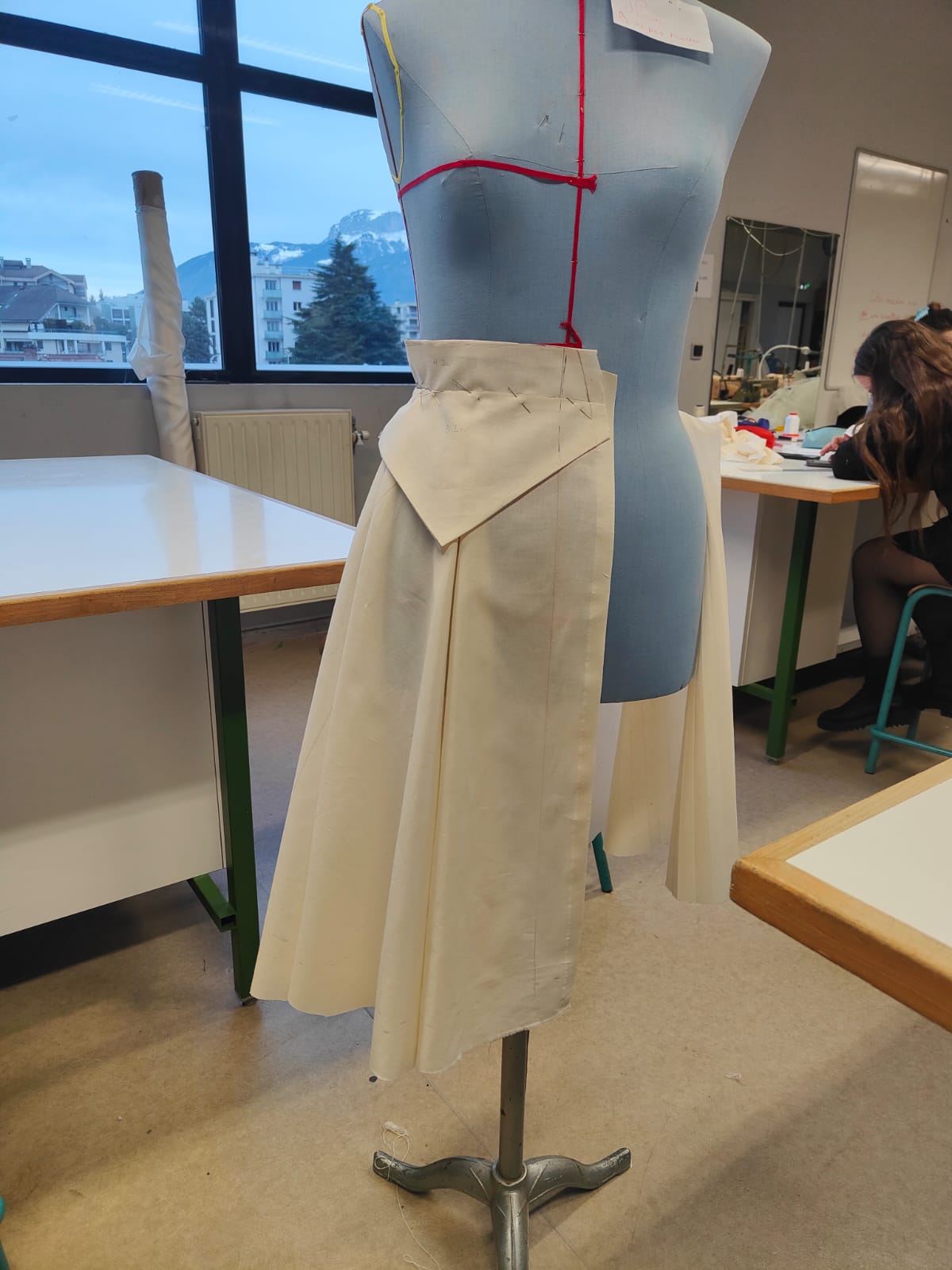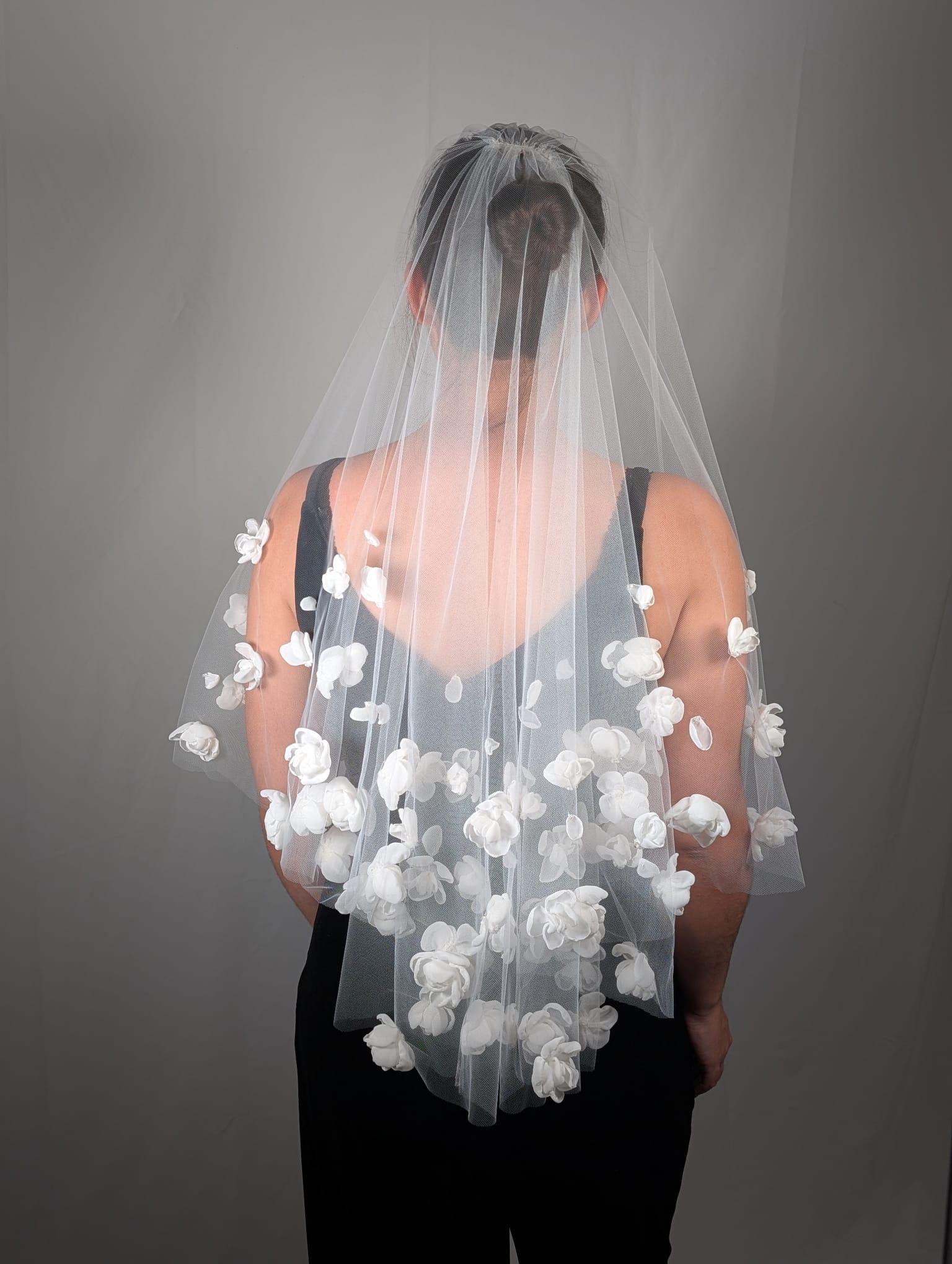 Ce travail d'ornementation est né d'une envi de sculpter le tissu. Les recherches se sont portées sur la création de fleurs en 3D, entièrement façonnées à la main. Tout l'enjeu de ces expérimentations textiles a été de transposer le mouvement de la nature dans la matière, afin d'y retrouver la fluidité et la délicatesse d'une fleur véritable.
